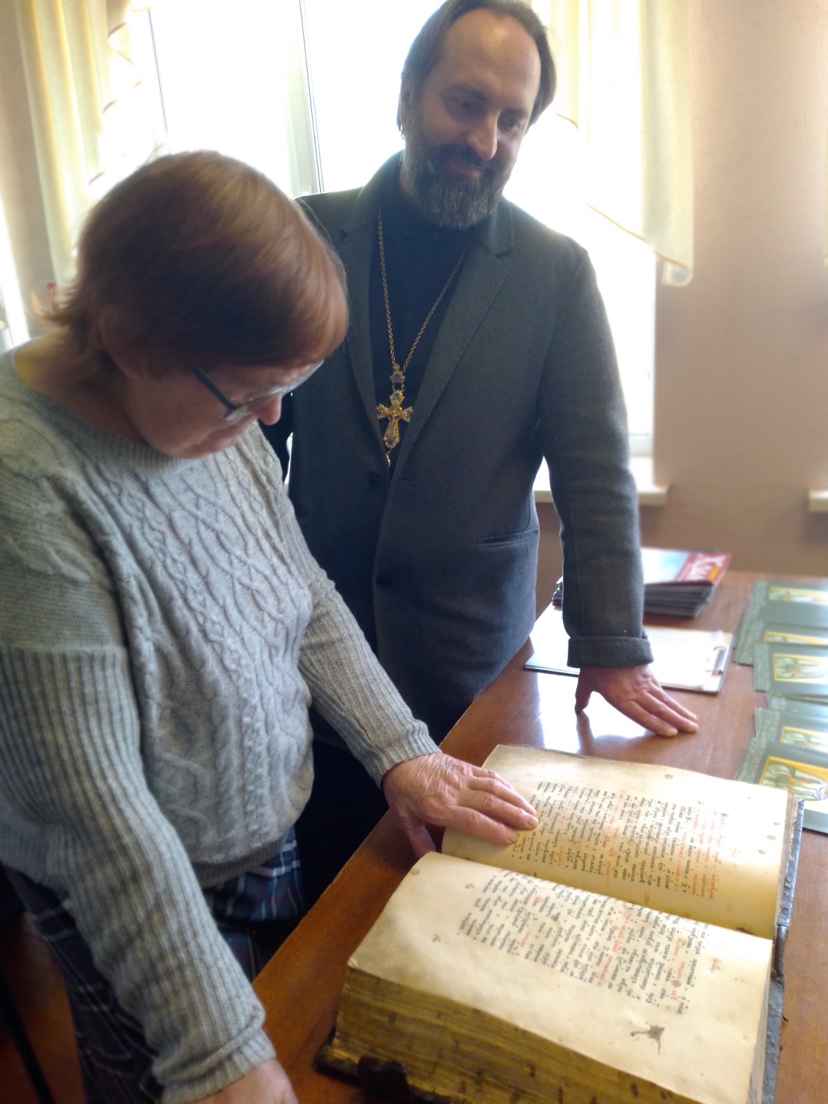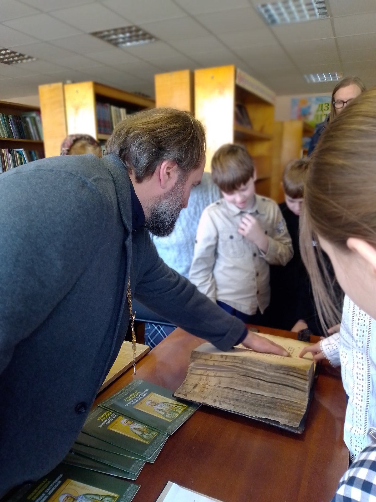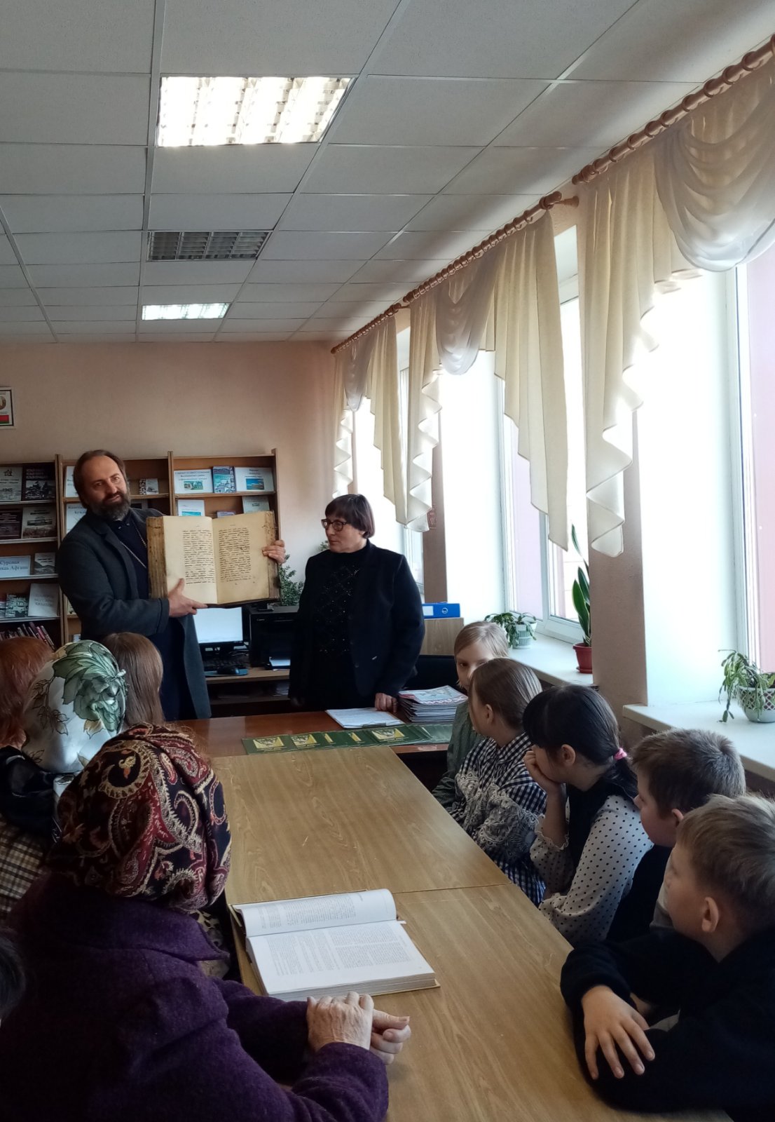 Библиотекарь подготовила выставку-просмотр православной литературы "Свет православной книги" по истории православия, провела обзор истории книгопечатания, о появлении на Руси первой печатной книги "Апостол" и ее создателе Иване Федорове (1564год), а также деятельности Франциска Скарины, Ефросинии Полоцкой, Симеона Полоцкого, Кирилла Туровского. На мероприятии присутствовал настоятель храма святых бессребреников Космы и Дамиана ан.Вишнево отец Александр Чурило. Отец Александр познакомил присутствующих с старинной книгой для богослужения (Евангелие), которой 105 лет, рассказал о главной книге для каждого православного, о книге книг Библии. Рассказал как правильно подготовиться к исповеди, как правильно поститься. После интересного рассказа участники задавали интересующие их вопросы. Беседа пошла в теплой атмосфере, многие получили ответы на свои вопросы. В конце встречи отец Александр пожелал здоровья, защиты ангела-хранителя.